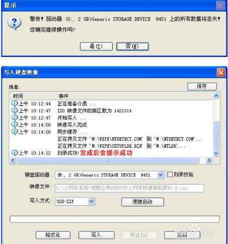 usb系統重裝下載安裝教程圖5 選擇“是”以繼續寫入數據 第四步,制作完成后就可以開始安裝系統了。將U盤插入上網本并開機,啟動時按DEL(或F2)進入主板CMOS設置,設置第一啟動設備為USB或可移動裝置,可以啟動即告成功