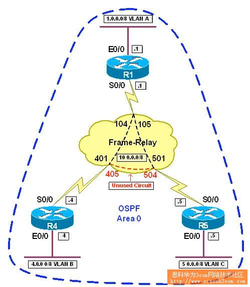 網(wǎng)絡(luò)技術(shù)是從1990年代中期發(fā)展起來的新技術(shù),它把互聯(lián)網(wǎng)上分散的資源融為有機(jī)整體,實(shí)現(xiàn)資源的全面共享和有機(jī)協(xié)作,使人們能夠透明地使用資源的整體能力并按需獲取信息。資源包括高性能計(jì)算機(jī)、存儲(chǔ)資源、數(shù)據(jù)資源、信息資源、知識(shí)資源、專家資源、大型數(shù)據(jù)庫(kù)、網(wǎng)絡(luò)、傳感器等。 當(dāng)前的互聯(lián)網(wǎng)只限于信息共享,網(wǎng)絡(luò)則被認(rèn)為是互聯(lián)網(wǎng)發(fā)展的第三階段。 目標(biāo): 在R1,R4和R5之間的幀中繼網(wǎng)絡(luò)中配置OSPF,網(wǎng)絡(luò)類型為broadcast,實(shí)現(xiàn)VLAN A, VLAN B和VLAN C的互通