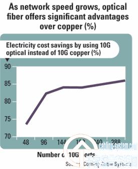 總而言之,在數(shù)據(jù)中心部署光纖網(wǎng)絡(luò)而不是銅纜系統(tǒng)將會(huì)大幅減少能源消耗、提高制冷效果、改善整體機(jī)架和架空地板的空間利用率。尤其在10G這樣的傳輸速率應(yīng)用中,光纖將比銅纜系統(tǒng)更具顯著的經(jīng)濟(jì)性。