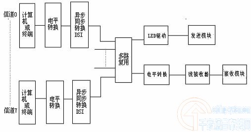 圖1光通信系統(tǒng)的基本組成結(jié)構(gòu)圖 它適合于光纖模擬通信系統(tǒng)中,而且也適用于光纖數(shù)字通信系統(tǒng)和數(shù)據(jù)通信系統(tǒng)。在光纖模擬通信系統(tǒng)中,電信號處理是指對基帶信號進(jìn)行放大、預(yù)調(diào)制等處理,而電信號反處理則是發(fā)端處理的逆過程,即解調(diào)、放大等處理。在光纖數(shù)字通信系統(tǒng)中,電信號處理是指對基帶信號進(jìn)行放大、取樣、量化,即脈沖編碼調(diào)制(PCM)和線路碼型編碼處理等,而電信號反處理也是發(fā)端的逆過程。對數(shù)據(jù)光纖通信,電信號處理主要包括對信號進(jìn)行放大,和數(shù)字通信系統(tǒng)不同的是它不需要碼型變換。 3光端機(jī)的作用和目前光端機(jī)的狀況 在光纖通信系統(tǒng)中,光發(fā)射機(jī)是光端機(jī)、光中繼器的重要組成部分,它的最基本功能是將要傳輸?shù)碾娦盘栒{(diào)制在光波上,并將其注入到光纖線路中。光接收機(jī)的主要功能是將接收的光信號變換為原電信號,并且用自動增益控制電路(AGC)保證穩(wěn)定的輸出,光接收的主要部件是光檢測器,它的主要任務(wù)是進(jìn)行光電轉(zhuǎn)換。從光發(fā)送端輸出經(jīng)光纜線路傳輸被衰減的光信號到達(dá)接收端已是很微弱的了,為了有效地進(jìn)行光電轉(zhuǎn)換,系統(tǒng)要求光檢測器要響應(yīng)度高、噪聲低,響應(yīng)速度快,工作穩(wěn)定可靠。 目前的數(shù)據(jù)光端機(jī)已經(jīng)有一段發(fā)展歷程了,不在是簡單的一路或四路的,也不在是單純的某一接口了,而已經(jīng)達(dá)到上百路(如120路、240路等),各種不同接口(RS-232、RS-485、USB等)相當(dāng)成熟的地步了,像武漢波仕電子、北京訊風(fēng)通信、杭州億幫通信等公司的主要產(chǎn)品就是光端機(jī),其中波仕電子的RS-232單模和多模的光端機(jī)還可以做到無須電源。本文僅就八路來說明其復(fù)用原理。 4數(shù)據(jù)光端機(jī)設(shè)計(jì)所要達(dá)到的目的和功能及意義 本設(shè)計(jì)為多路RS-232C接口標(biāo)準(zhǔn)是一種廣泛使用的普及標(biāo)準(zhǔn)。它涉及使用的普及標(biāo)準(zhǔn)。它涉及的范圍很廣,遠(yuǎn)遠(yuǎn)超出了通信和計(jì)算機(jī)的領(lǐng)域。60年代中期,幾乎毫無例外的使用電話交換網(wǎng)實(shí)現(xiàn)遠(yuǎn)程訪問,于是RS-232C接口進(jìn)行本地通信,因此使用更加廣泛。本設(shè)計(jì)正是基于RS-232串行口通過光纖傳輸。 隨著分布計(jì)算機(jī)的建立,所需通信設(shè)備費(fèi)用逐漸成為用戶所關(guān)心的主要問題,為了減少這些費(fèi)用,通過研究大量網(wǎng)絡(luò)結(jié)構(gòu),從而確定盡可能采用專用設(shè)備。很多網(wǎng)絡(luò)是地理分布的用戶訪問公用計(jì)算設(shè)備,將中心的地區(qū)建設(shè)成為鏈接這些用戶到計(jì)算機(jī)的服務(wù)中心。盡管當(dāng)終端業(yè)務(wù)量較少,使用專用租用線費(fèi)用不太合理,但若能采用很多終端共用通信設(shè)備的結(jié)構(gòu),一般就能減少對一組用戶提供通信的積累費(fèi)用,而多路復(fù)用器的利用就可能用一條高速線路承擔(dān)原來有一組低俗線路分別傳輸?shù)臉I(yè)務(wù)量,所以當(dāng)同一地理區(qū)域的大量數(shù)據(jù)終端進(jìn)行通信時(shí),或者但任意距離的很多租用線并行傳輸時(shí)應(yīng)考慮使用多路復(fù)用器。 本數(shù)據(jù)光端機(jī)采用多路的設(shè)計(jì),不但可以大大利用了線路,充分利用光纖巨大的帶寬資源。并且可以更廣泛的應(yīng)用于各個(gè)領(lǐng)域,本設(shè)計(jì)的八路復(fù)用技術(shù),可用八路信道傳輸不同的信息,將不同信息復(fù)用到一條光中進(jìn)行傳輸,節(jié)省了設(shè)備,在現(xiàn)場的應(yīng)用中可在同一系統(tǒng)中,將多種控制信息和數(shù)據(jù)信息用一臺光端機(jī)進(jìn)行傳輸,可同時(shí)連接計(jì)算機(jī)及其他符合RS-232標(biāo)準(zhǔn)的終端,方便控制和操作。這就是多路復(fù)用光端機(jī)的設(shè)計(jì)意義之所在,本文僅以八路復(fù)用來起到拋磚引玉的作用。 5數(shù)據(jù)光端機(jī)的設(shè)計(jì)整體說明 整體電路的原理框圖如圖2所示:它將若干終端多路接入一個(gè)高速數(shù)據(jù)鏈路中,發(fā)送過程由計(jì)算機(jī)或終端傳送來的RS-232C標(biāo)準(zhǔn)信號先要進(jìn)行電平轉(zhuǎn)換,將RS-232C電平轉(zhuǎn)換為TTL電平,以便和后續(xù)電路兼容,再經(jīng)過MOTOROLA的MC145428異步同步轉(zhuǎn)換芯片將RS-232C幀結(jié)構(gòu)中的起始位,停止位去除后,轉(zhuǎn)換為同步輸出。再經(jīng)過一個(gè)多路復(fù)用電路將多路信號復(fù)用唯一路徑LED驅(qū)動后再對光源進(jìn)行調(diào)制,將電信號轉(zhuǎn)換為光信號發(fā)送到光纖中傳輸。