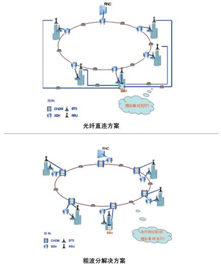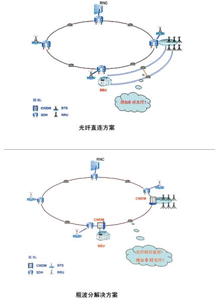 圖1 CN傳輸網(wǎng)引入WDM 2.基站光纖拉遠(yuǎn)傳輸方案探討 中興通訊在TD-SCDMA基站技術(shù)上領(lǐng)先于業(yè)界,采用第二代分布式TD基站(BBU+RRU)技術(shù),率先在青島現(xiàn)網(wǎng)應(yīng)用。BBU和RRU之間通過光信號(hào)通信,相比傳統(tǒng)的大量電纜饋線到塔頂?shù)姆绞骄邆湟韵聝蓚(gè)優(yōu)點(diǎn): (1)解決了線纜復(fù)雜、施工難度大的問題; (2)BBU和RRU分離,組網(wǎng)靈活方便,解決了機(jī)房、電源等多種難題。 通常BBU和RRU間采用光纖直連承載,然而經(jīng)過分析,在BBU:RRU為1:N的應(yīng)用場(chǎng)景下,用粗波分設(shè)備組網(wǎng),以波長(zhǎng)替代裸光纖將節(jié)省大量光纖資源,對(duì)2G網(wǎng)絡(luò)中已鋪設(shè)的光纖實(shí)現(xiàn)利舊復(fù)用,使網(wǎng)絡(luò)具有良好的擴(kuò)展性。此外,避免了在密集城區(qū)鋪設(shè)新光纜,保證網(wǎng)絡(luò)快速建設(shè)。圖2和圖3分別顯示了在宏基站、微基站應(yīng)用環(huán)境中,光纖直連及粗波分方案的應(yīng)用效果對(duì)比。