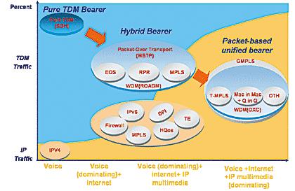 圖3 微基站“BBU+ RRU”通信環(huán)境下應(yīng)用效果對(duì)比 綜上所述,TD配套傳輸網(wǎng)絡(luò)主要采用MSTP技術(shù),實(shí)現(xiàn)對(duì)TDM及數(shù)據(jù)業(yè)務(wù)的接入、處理、調(diào)度,核心層及RRU-BBU間適度引入WDM,實(shí)現(xiàn)大顆粒數(shù)據(jù)業(yè)務(wù)的高效傳送與調(diào)度,節(jié)省光纖資源。該方案既能滿足TD當(dāng)前的建設(shè)需求,也能適應(yīng)TD中遠(yuǎn)期的動(dòng)態(tài)發(fā)展。 二、TD傳輸網(wǎng)建設(shè)方式探討 現(xiàn)有傳輸網(wǎng)是否已滿足TD網(wǎng)絡(luò)建設(shè)需求?是否需重新規(guī)劃建設(shè)傳輸網(wǎng)絡(luò)?這是網(wǎng)絡(luò)規(guī)劃實(shí)施者必須考慮的問題。下面將對(duì)現(xiàn)網(wǎng)與所需TD配套傳輸網(wǎng)絡(luò)進(jìn)行比較: 從站點(diǎn)部署角度看,受覆蓋能力及規(guī)劃方式的限制,部分TD基站與2G基站不同址; 密集商業(yè)區(qū)、奧運(yùn)場(chǎng)館大多采用的“BBU+RRU”分布式基站方式將導(dǎo)致帶寬需求急劇增長(zhǎng),現(xiàn)有網(wǎng)絡(luò)部分區(qū)域接近飽和,剩余帶寬難以支撐TD網(wǎng)絡(luò)的新增業(yè)務(wù)需求。此外,由于幾年來2G、大客戶等業(yè)務(wù)劇增及業(yè)務(wù)的突發(fā)性和不平衡性,部分區(qū)域網(wǎng)絡(luò)雖具有較大的容量,但在全網(wǎng)調(diào)度方面出現(xiàn)“瓶頸”,網(wǎng)絡(luò)資源利用率低、網(wǎng)絡(luò)業(yè)務(wù)不夠安全等問題也日益突出; 早期傳輸網(wǎng)絡(luò)主要提供2M通路業(yè)務(wù),接口速率低、種類單一,中低端設(shè)備不具備容量平滑升級(jí)能力,數(shù)據(jù)類業(yè)務(wù)處理能力較差,尤其是大顆粒數(shù)據(jù)業(yè)務(wù)的承載效率低; TD網(wǎng)絡(luò)目前仍處于試驗(yàn)性質(zhì),距離大規(guī)模商用尚有一段距離,TD網(wǎng)絡(luò)持續(xù)的技術(shù)演進(jìn)、基站站型升級(jí)、規(guī)劃調(diào)整等將給現(xiàn)有網(wǎng)絡(luò)帶來振蕩,對(duì)現(xiàn)有2G業(yè)務(wù)、大客戶業(yè)務(wù)等有不利影響。 結(jié)合TD網(wǎng)絡(luò)站點(diǎn)規(guī)劃及TD技術(shù)發(fā)展預(yù)測(cè)等各方面情況,建議規(guī)劃獨(dú)立的TD配套傳輸網(wǎng)絡(luò),以新建網(wǎng)絡(luò)為主,適度引入波分技術(shù)。 三、TD傳輸網(wǎng)遠(yuǎn)期發(fā)展趨勢(shì) 近年來,通信行業(yè)中數(shù)據(jù)業(yè)務(wù)迅猛發(fā)展,業(yè)務(wù)IP化已成大勢(shì)所趨,數(shù)據(jù)多媒體業(yè)務(wù)尤其是語音、視頻IP化取得了重大進(jìn)展,導(dǎo)致了傳輸網(wǎng)承載信號(hào)從TDM到IP的逐漸轉(zhuǎn)變。 當(dāng)前,技術(shù)成熟、應(yīng)用廣泛的MSTP技術(shù)強(qiáng)調(diào)依托于SDH平臺(tái)。MSTP利用SDH網(wǎng)絡(luò)的多余電路(時(shí)隙)資源,實(shí)現(xiàn)對(duì)數(shù)據(jù)業(yè)務(wù)尤其是以太網(wǎng)業(yè)務(wù)的透明傳送,在此基礎(chǔ)上逐步實(shí)現(xiàn)了功能的深化和演進(jìn),如增加L2交換、內(nèi)嵌RPR功能以及MPLS功能等。但隨著3GIP化演進(jìn)和相關(guān)技術(shù)及標(biāo)準(zhǔn)的成熟,伴隨著分組傳送技術(shù)、標(biāo)準(zhǔn)和產(chǎn)業(yè)鏈的成熟,以現(xiàn)有光纖網(wǎng)絡(luò)結(jié)構(gòu)為基礎(chǔ),建設(shè)基于分組傳送技術(shù)的城域傳送網(wǎng),并輔以大容量WDM(OXC)的傳輸骨干網(wǎng)是未來的重要發(fā)展趨勢(shì),參見圖4。