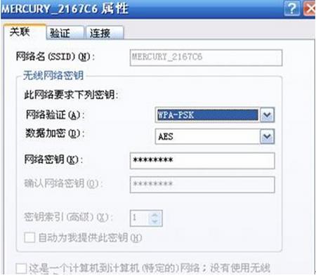 4)選擇您的無線網絡名稱,點擊“屬性”,在無線網絡密鑰中核對網絡驗證是否與路由器中加密方式一致。如果不一致,請先修改驗證方式,再重新輸入正確的網絡密鑰。
