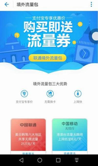支付寶 1.打開(kāi)登陸支付寶軟件,找到【便民生活】板塊下的【境外流量包】服務(wù); 2.這里有【中國(guó)聯(lián)通】和【中國(guó)移動(dòng)】?jī)煽罹惩饬髁堪蛇x,中國(guó)聯(lián)通支持港澳臺(tái)、美國(guó)、日本、韓國(guó)等六大地區(qū)的流量購(gòu)買(mǎi),而中國(guó)移動(dòng)只支持港澳臺(tái)流量購(gòu)買(mǎi); 3.進(jìn)入中國(guó)聯(lián)通境外流量包購(gòu)買(mǎi)頁(yè)面后,勾選境外地區(qū)、填寫(xiě)手機(jī)號(hào)碼、境外使用時(shí)間,最后提交購(gòu)買(mǎi)即可; 4.進(jìn)入中國(guó)移動(dòng)境外流量包購(gòu)買(mǎi)頁(yè)面后,選擇符合自己需求的套餐即可。
