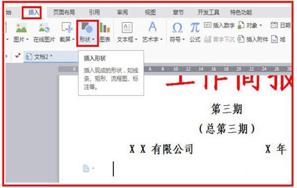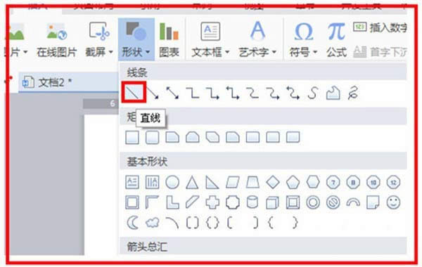 3、現(xiàn)在開始插入橫線,找到插入,單擊一下,找到形狀,單擊一下,選擇直線,單擊選中直線。