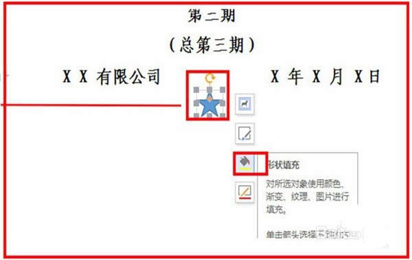 6、接著插入五角星,找到插入,找到形狀,找到五角星,單擊選中五角星,五角星出現(xiàn)在文檔后,單擊選中,可以進行拖動,填充進行設(shè)置顏色等,把五角星的邊線需要設(shè)置成無顏色。
