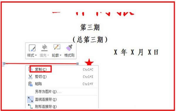 7、最后,再選中直線,單擊右鍵,單擊復(fù)制,在一旁,單擊粘貼,把直線移動到五角星的另一側(cè),調(diào)整一下和上方文字的距離等,在直線的下方輸入簡報的具體內(nèi)容名稱,另起一行,輸入正文就完成了簡報。