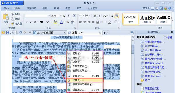 軟件是一系列按照特定順序組織的計算機數據和指令的集合。一般來講軟件被劃分為編程語言、系統軟件、應用軟件和介于這兩者之間的中間件。硬件是“計算機硬件”的簡稱。與“軟件”相對,電子計算機系統中所有實體部件和設備的統稱。 隨著網絡技術的發展,現在大家寫文章都要在WORD或者WPS文字中編寫,但是我們通常在編輯完一篇文章完會發現,這篇文章十分密集,讓人感覺行與行之間太過擁擠,下面小編就為大家解決此類問題。 首先,選中你要進行調整設置的文章,可以全文設置,也可以段落設置。下面以全文為例進行段落行距的設置:ctrl+a(全選)—右擊文章—段落。