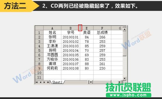 2、CD兩列已經被隱藏起來了,效果如下。