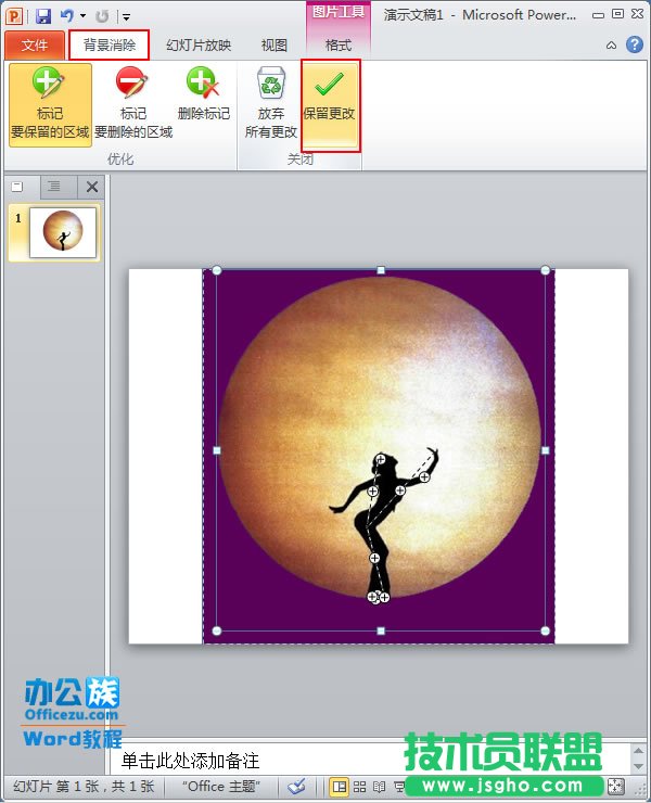 單擊【背景消除】選項卡下的【保留更改】?纯矗遣皇潜A袅宋覀兿胍脑铝梁腿诵渭粲。