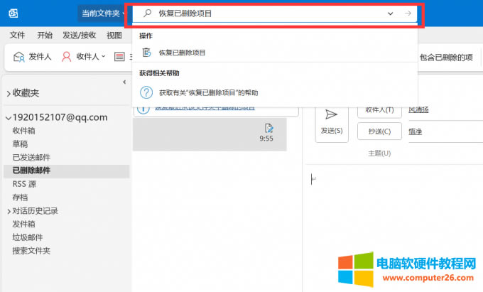 圖9 勾選要恢復的文件 4.還可以通過outlook上方的搜索欄進行搜索,只需要輸入恢復已刪除項目,點擊即可跳轉到恢復頁面。