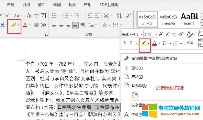圖4:選擇文本信息 2.高亮命令 除了工具欄,我們也可以點擊鼠標右鍵,在快捷列表上方找到“文本突出顯示顏色”命令,直接點擊命令圖標,就可以為所選文字添加高亮效果了。