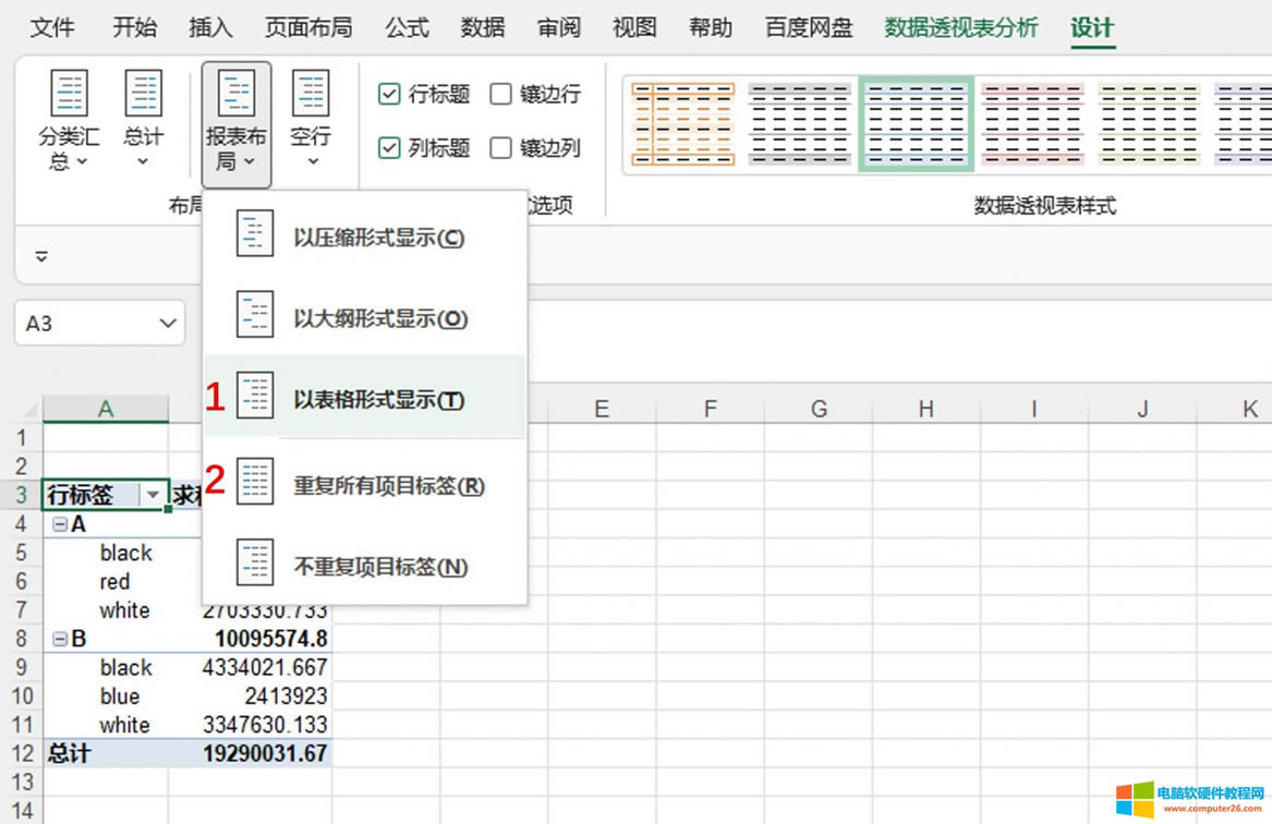 圖5:重復所有項目的標簽 二、excel數據透視表怎么做分類匯總 Microsoft 365版excel數據透視表的設計功能,提供了分類匯總的設置選項,可設置表內的數據匯總形式。 但需要注意的是:如果“以表格形式顯示”布局,只能選擇“在組的底部顯示”;如果是其他兩個報表布局(大綱或壓縮形式),就可以選擇在組的頂部或底部顯示。