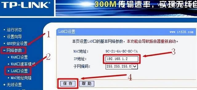登錄自己的無線路由器設(shè)置界面,點擊網(wǎng)絡(luò)參數(shù)——>“LAN口設(shè)置”——>修改“IP本例修改為:192.168.1.2