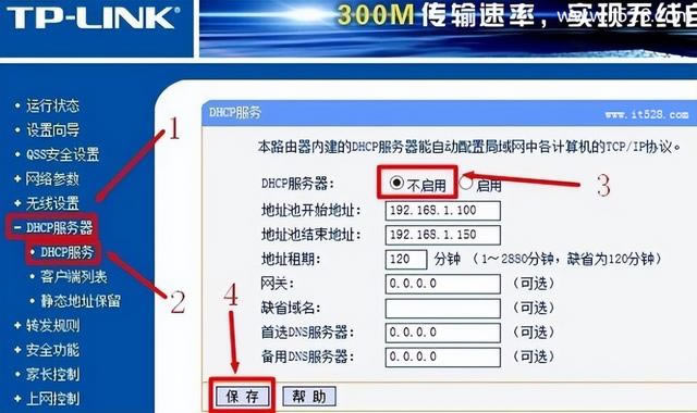 輸入修改后的瀏覽器IP再次登錄無線路由器的設(shè)置界面,點擊DHCP服務(wù)器”——>“DHCP服務(wù)”——>“DHCP服務(wù)器選擇:不啟用——>點擊保存。