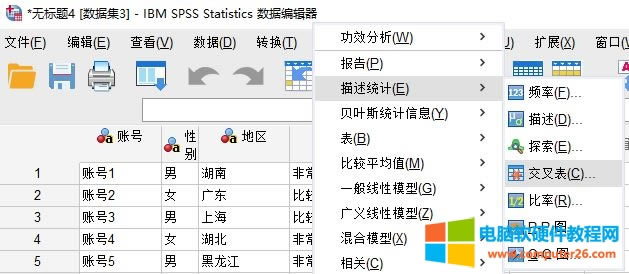 | SPSS由IBM公司出品,它提供了包括描述性統計、推斷性統計、因子分析、聚類分析、回歸分析等多種統計分析功能,并包括文本分析、機器學習算法、數據分析模型等。SPSS的界面友好,易于操作,能夠快速從數據中提取有用的洞察和分析,廣泛應用于教育、心理、醫學、市場、人口、保險等多個研究領域,也用于產品質量控制、人事檔案管理和日常統計報表等。 IBM SPSS Statistics的列聯表分析,也稱為交叉表分析,用于分析兩個或以上分組變量的相關關系,在分析影響滿意度的因素、藥物有效性等方面都有很好的應用。 本文將以較為簡單的二乘二列聯表卡方檢驗為例,介紹一下IBM SPSS Statistics的列聯表分析功能。 一、打開數據文件 首先,我們打開如圖1所示的一組數據,包含了性別、地區與滿意度的數據,用以研究性別與滿意度的相關關系。 由于當前數據中的滿意度變量包含了非常不滿意、比較不滿意、一般、比較滿意、非常滿意五個變量值,為了構建二乘二列聯表,需要轉換一下數據。