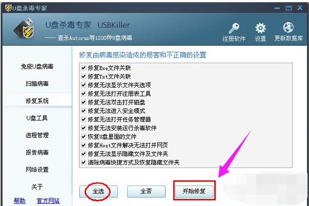 電腦載圖3 打開主界面后,在左側(cè)單擊修復(fù)系統(tǒng),選擇“全選”,點(diǎn)擊“開始修復(fù)”就可以使文件或數(shù)據(jù)恢復(fù)到原有的設(shè)置了?梢孕迯(fù)“無法顯示隱藏文件或文件夾”、“雙擊不能打開磁盤”和“U盤無法運(yùn)行殺毒軟件”等情況。