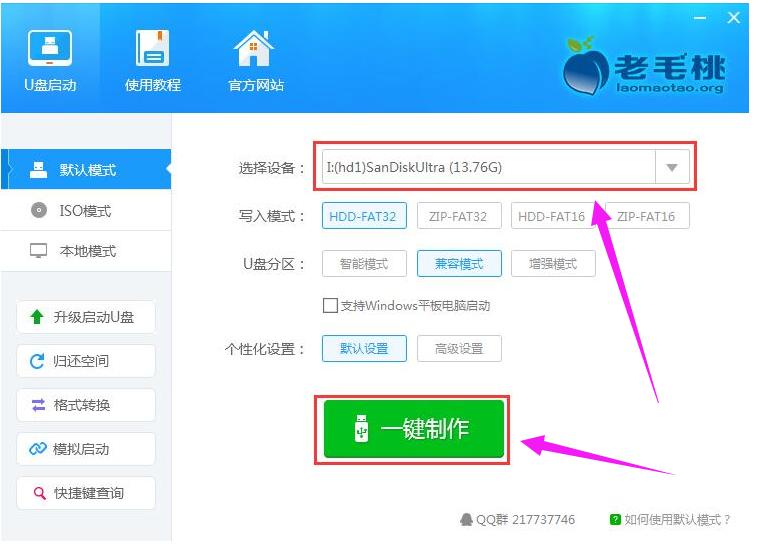 啟動盤載圖6 打開老毛桃u盤啟動盤制作工具后,將u盤插入電腦usb接口,程序會自動掃描,我們只需在下拉列表中選擇用于制作的u盤,然后點擊“一鍵制作”按鈕