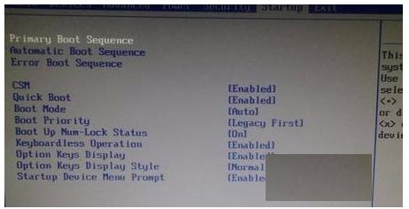 首先,在開機聯想LOGO界面點擊F1,進入BIOS界面,“→”右鍵頭移至“Startup”