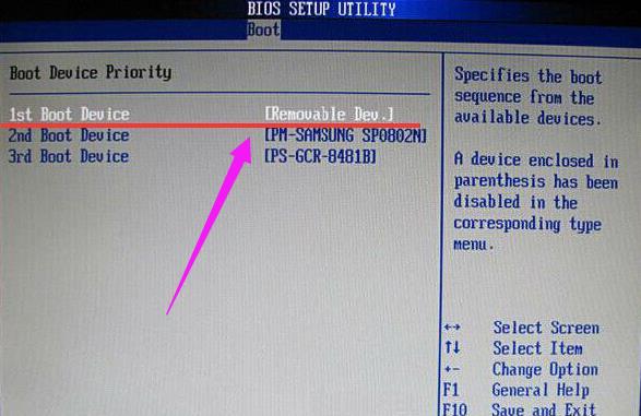 冠銘主板示例3 在打開的Boot Device Priority設置界面中,移動光標選擇“1st Boot Device(第一啟動項)”回車確認,在彈出的小窗口中選擇u盤啟動即可,完成所有設置之后,按F10鍵保存并且重啟電腦。
