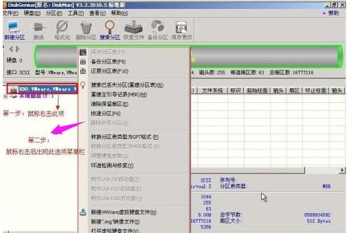 分區(qū)硬盤示例3 當(dāng)鼠標(biāo)放在需要分區(qū)的硬盤上面,鼠標(biāo)點(diǎn)右鍵會出現(xiàn)下面的選擇菜單