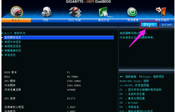 技嘉主板圖解詳情-1 進(jìn)入到uefi bios界面后,把右上角語言顯示處設(shè)置為“簡(jiǎn)體中文”項(xiàng)