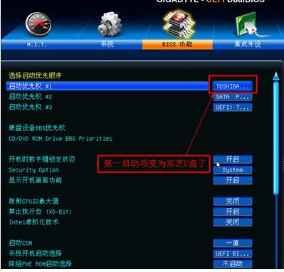 技嘉主板圖解詳情-2 選擇“bios功能”設(shè)置,再點(diǎn)擊“啟動(dòng)優(yōu)先權(quán)#1”選項(xiàng)
