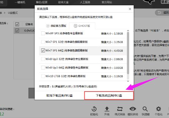 U盤啟動盤載圖5 選擇要下載的系統,并制作U盤。 黑鯊裝機大師為我們提供了“微軟官方原版”和“GHOST版”,32位、64位的各種Windows系統都有,大家可以根據自己的喜好,決定制作哪種系統的啟動U盤。 在此選擇的是GHOST版的win7 SP1 64位 純凈綠色旗艦最新版。