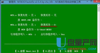6、如果你硬盤里有多個系統,它會然后軟件會自動找出你硬盤中的所有系統,修復每個系統的引導,并且修復系統引導菜單。 ![]() 7、修復成功后,我們點擊退出即可,然后重啟電腦,拔出U盤,讓電腦從硬盤里啟動。 ![]() 方法二、如果上面沒解決,我們繼續使用本工具來深度修復。 依然重新插入U盤,然后重啟電腦,依然從U盤啟動進win8pe系統,依然找到NTBOOT系統引導修復工具,打開它。 跟之前不同的是,這里不選自動修復,我們選擇2、高級