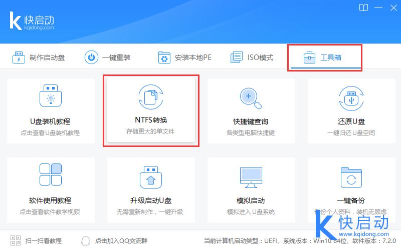 U盤,全稱USB閃存盤,英文名“USB flash disk”。 它是一種使用USB接口的無需物理驅動器的微型高容量移動存儲產品,通過USB接口與電腦連接,實現即插即用。U盤連接到電腦的USB接口后,U盤的資料可與電腦交換。而之后生產的類似技術的設備由于朗科已進行專利注冊,而不能再稱之為“優盤”,而改稱“U盤”。后來,U盤這個稱呼因其簡單易記而因而廣為人知,是移動存儲設備之一,F在市面上出現了許多支持多種端口的U盤,即三通U盤(USB電腦端口、iOS蘋果接口、安卓接口)。 雖說u盤有FAT32和NTFS這兩種格式之分,但是大家都想將U盤轉換成NTFS格式,以便于存儲大于4G以上的文件。那么,U盤如何轉換成NTFS格式?其實我們只需要使用軟件,就能一步到位解決問題,今天我們一起來瞧瞧吧。 1、將U盤插入電腦,下載U盤啟動盤制作工具并雙擊打開,在軟件界面上找到工具箱,點擊工具箱中的“NTFS轉換”圖標,如下圖所示: