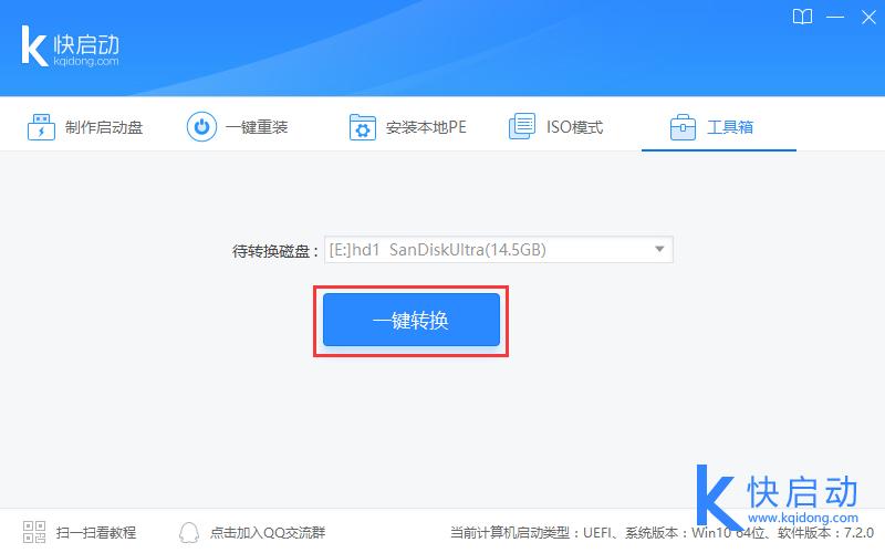![]() 2、選擇需要進行格式轉換的磁盤,然后點擊“一鍵轉換”,隨后U盤啟動盤制作工具便開始進行格式轉換,如下圖所示: