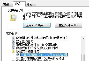 在系統打開的文件夾選項窗口里面,大家把界面切換到查看這一欄,其次找到下方的高級設置,其次,我們就能夠在高級窗口里面找到“不顯示隱藏的文件、文件夾和驅動器“這個選項,大家把這個選項更改為“顯示隱藏的文件、文件夾和驅動器”選項,并且用鼠標點擊下方的確定按鈕退出窗口即可。