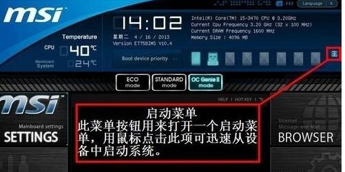 ![]() 二、使用啟動菜單啟動U盤 1.開機按Del進入UEFI BIOS后,進入到UEFI主界面,找到主設置界面的啟動菜單,在右上角位置,點擊它。如下圖所示
