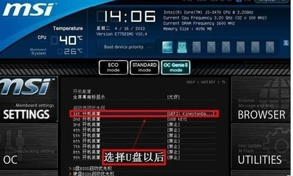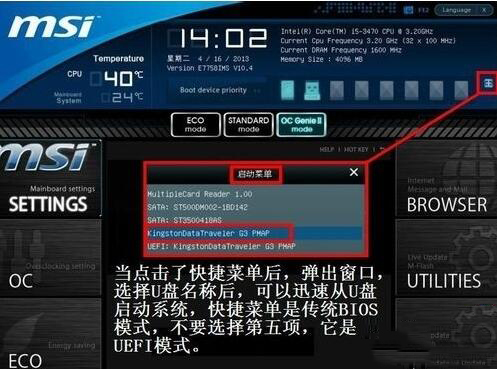 U盤,全稱USB閃存盤,英文名“USB flash disk”。 它是一種使用USB接口的無需物理驅動器的微型高容量移動存儲產品,通過USB接口與電腦連接,實現即插即用。U盤連接到電腦的USB接口后,U盤的資料可與電腦交換。而之后生產的類似技術的設備由于朗科已進行專利注冊,而不能再稱之為“優盤”,而改稱“U盤”。后來,U盤這個稱呼因其簡單易記而因而廣為人知,是移動存儲設備之一,F在市面上出現了許多支持多種端口的U盤,即三通U盤(USB電腦端口、iOS蘋果接口、安卓接口)。 筆記本電腦如何設置U盤啟動?當你決定u盤裝系統的時候,制作一個成功的u盤啟動盤是重點之一,同時也需要了解清楚設置u盤啟動盤,小伙伴千萬不要覺得bios設置u盤啟動會很難,今天快啟動小編為大家分享詳細的操作教程,一起來看看吧。 一、用快捷熱鍵設置啟動U盤方式 1.下載u盤啟動盤制作工具,將制作好的U盤插入電腦USB接口,待開機畫面顯示時,按快捷啟動鍵,這里以微星為例,按F11。 2.接著就會出現啟動選擇菜單,這里我們可以看到U盤的名稱,上下移動光標選擇它,然后按回車,即可進入啟動U盤。如果這里是光盤啟動,看到的則是光驅的名稱,選擇光驅,按回測,同樣可以進入光盤啟動。如下圖所示
