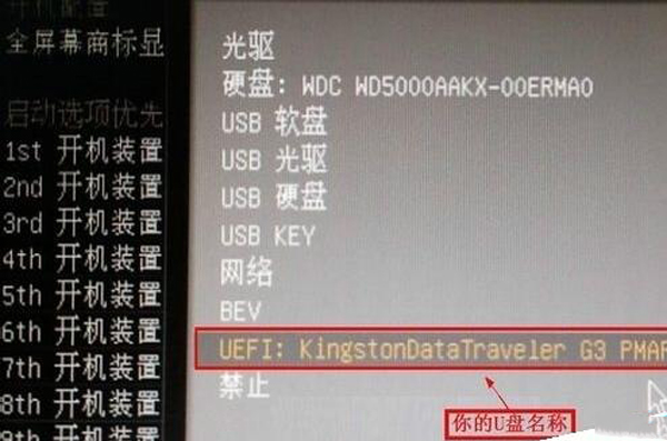 ![]() 2.接著在彈出的啟動菜單窗口,移動光標選擇第四項kingstonDataTraveler G3 PMAP,即U盤的名稱,如果要從光盤啟動,選擇光驅的名稱即可。