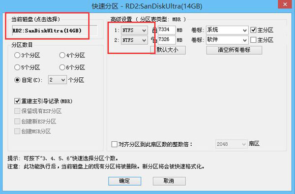 U盤,全稱USB閃存盤,英文名“USB flash disk”。 它是一種使用USB接口的無需物理驅動器的微型高容量移動存儲產品,通過USB接口與電腦連接,實現即插即用。U盤連接到電腦的USB接口后,U盤的資料可與電腦交換。而之后生產的類似技術的設備由于朗科已進行專利注冊,而不能再稱之為“優盤”,而改稱“U盤”。后來,U盤這個稱呼因其簡單易記而因而廣為人知,是移動存儲設備之一,F在市面上出現了許多支持多種端口的U盤,即三通U盤(USB電腦端口、iOS蘋果接口、安卓接口)。 u盤裝系統時經常遇到電腦沒有usb啟動選項,要想實現u盤啟動覺得是一件無法辦到的事兒。那么,電腦沒有usb啟動選項如何實現u盤啟動?相信大家對這方面的了解都不夠,所以今天快啟動小編為大家做個詳細分享吧。 1、將u盤快速分成兩個NTFS的分區(一個分區會默認為系統,另一個是軟件),如圖所示: