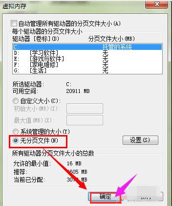 清理垃圾載圖7 在“虛擬內(nèi)存”中,勾選“無分頁文件”并按“確定”