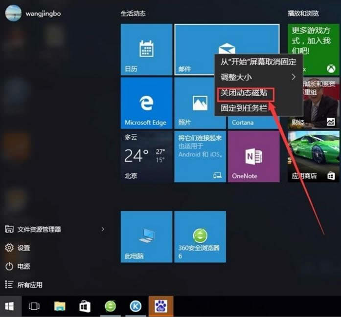 基本操作載圖6 怎么樣關閉開始屏幕上的動態磁貼: 對于我們不喜歡的磁貼內容,我們可以選擇關閉動態磁貼。WIN10中的操作方法如下:左鍵單擊左下角的“開始菜單”,在彈出的“開始菜單”界面中右鍵單擊所要關閉的動態磁貼,在彈出的菜單中選擇“關閉動態磁貼”項。