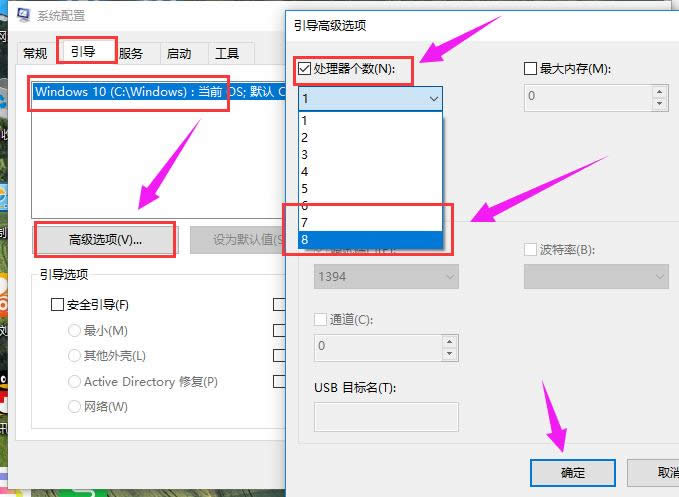 Win10載圖8 點擊“引導”,選擇當前系統,點擊“高級選項”,在彈出的界面勾上“處理器個數”,點擊下拉箭頭,選擇最大的數字,然后點擊確定。