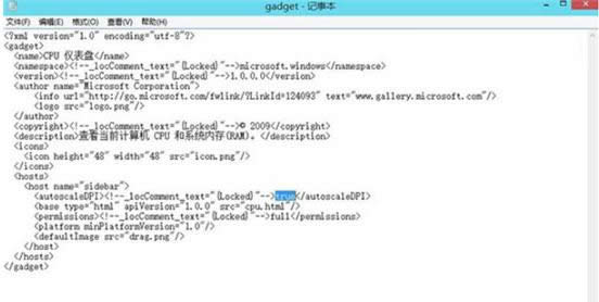 添加小工具載圖7 使用記事本來打開這個gadget.xml文件,將《autoscaleDPI》《!--_locComment_text=“{Locked}”--》true《/autoscaleDPI》這一行中的ture改為false,然后保存修改,并選擇將該文件保存到桌面。然后在從桌面上拷貝到文件夾中替換掉原來的文件。好了,現(xiàn)在就可以正常顯示小工具了。