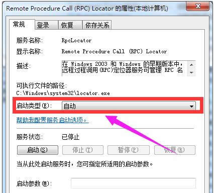 服務(wù)器載圖3 從打開的“RPC Loader”屬性窗口中,就會發(fā)現(xiàn)當(dāng)前此服務(wù)處于停止?fàn)顟B(tài),此時我們需要點擊“啟動類型”下拉列表,將其設(shè)置為“自動”。
