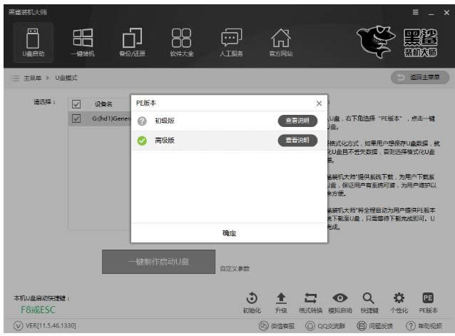 黑鯊裝機圖解詳情-1 點擊右下角的PE版本,選擇將要制作的U盤啟動盤內(nèi)的PE系統(tǒng)。黑鯊提供了初級版和高級版兩種版本。一般的裝機用戶選擇初級版即可,PE版本選擇完成后,選中U盤,點擊“一鍵制作啟動U盤”。