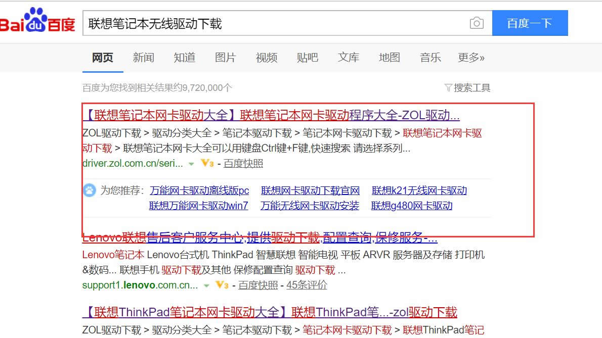 Windows 7,中文名稱視窗7,是由微軟公司(Microsoft)開發的操作系統,內核版本號為Windows NT 6.1。Windows 7可供家庭及商業工作環境:筆記本電腦 、平板電腦 、多媒體中心等使用。和同為NT6成員的Windows Vista一脈相承,Windows 7繼承了包括Aero風格等多項功能,并且在此基礎上增添了些許功能。 聯想筆記本驅動應該怎樣下載呢?小編相信還是有著許多小伙伴是不知道如何下載聯想筆記本驅動的,不知道的話沒關系,小編現在就把下載聯想筆記本驅動的方法來分享給你,一起往下看看吧。 最近小編發現一些小伙伴想要知道聯想筆記本官方驅動應該怎么下載,所以小編就花了一些時間去了解了一下安裝聯想筆記本官方驅動的下載方法,今天小編就把下載聯想筆記本官方驅動的方法來分享給你們。 1,加入百度后,輸入"聯想筆記本無線驅動下載”之后如圖操作