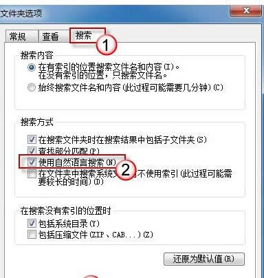 打開文件夾和搜索選項 切換到“搜索”選項卡下,勾選“使用自然語言搜索”項。
