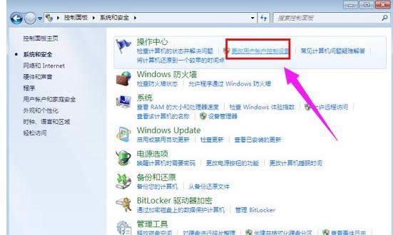 點擊操作中心下方的“更改用戶賬戶控制設置”
