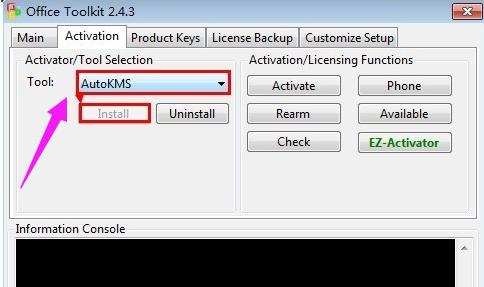 激活電腦圖解1 進(jìn)入Microsoft Toolkit設(shè)置界后,點(diǎn)擊Activation 選項(xiàng)卡下面選擇要安裝一個(gè)AutoKMS