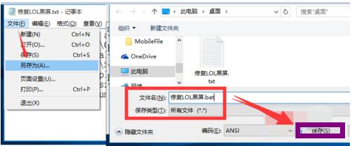 英雄聯(lián)盟電腦圖解1 點(diǎn)擊“文件”-“另存為”項(xiàng),從打開的“另存為”窗口中,將“文件類型”設(shè)置為“所有文件(*.*)”,同時(shí)將此文件名修改成“修復(fù)LOL黑屏.bat”,點(diǎn)擊“保存”按鈕。