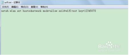 Windows 7,中文名稱視窗7,是由微軟公司(Microsoft)開發的操作系統,內核版本號為Windows NT 6.1。Windows 7可供家庭及商業工作環境:筆記本電腦 、平板電腦 、多媒體中心等使用。和同為NT6成員的Windows Vista一脈相承,Windows 7繼承了包括Aero風格等多項功能,并且在此基礎上增添了些許功能。 很多win7用戶都向小編反映說,win7開wifi方法不會,那怎樣才能實現win7開wifi呢?說實話win7開wifi非常簡單,只需要短短三個步驟,就能完成win7開wifi方法了。接下來,小編就給大家帶來最簡單實用的win7開wifi方法介紹。 第一步:在桌面上新建一個文本文件(即txt文件),打開文本文件,輸入 netsh wlan set hostednetwork mode=allow ssid=wifitest key=12345678 wifitest可以隨意命名,就是你搜索的wifi名稱,而key就是連接wifi的密碼,也可以隨意更改。 輸入完成保存(ctrl+s),更改下文件后綴名,把txt改成bat。 鼠標右鍵點擊,以管理員身份運行(如果沒有這個就直接運行)