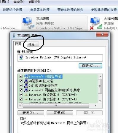 最簡單實用的win7開wifi方法介紹圖三 第二步:需要開啟本地網絡的共享,點擊你電腦桌面右下角的電腦圖標,打開網絡和共享中心,選擇更改適配器,選擇你聯通網絡的網絡,例如我的是本地連接(有些是寬帶連接),右鍵選擇屬性,彈出的框中就會有共享選項(如果沒有,請找到你自己的 設備管理器-->網絡適配器-->選中你聯通的網絡進行驅動更新,或者卸載重裝,電腦重啟),夠選中第一個點擊確定就可以了。