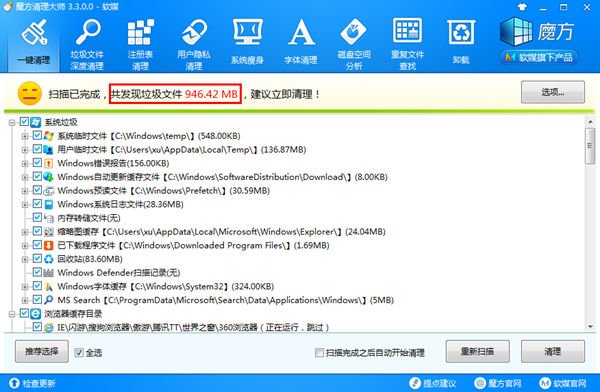 2、魔方清理大師是目前最強悍的系統(tǒng)垃圾清理工具。系統(tǒng)垃圾、瀏覽器緩存、視頻音樂目錄緩存、常用軟件緩存等都可以清除,而且非常關(guān)鍵的是,不同于其他軟件長時間的掃描,魔方清理大師的掃描速度非常快,而且掃描的也很干凈。如圖所示,清理大師就掃描出946.42M的垃圾文件。
